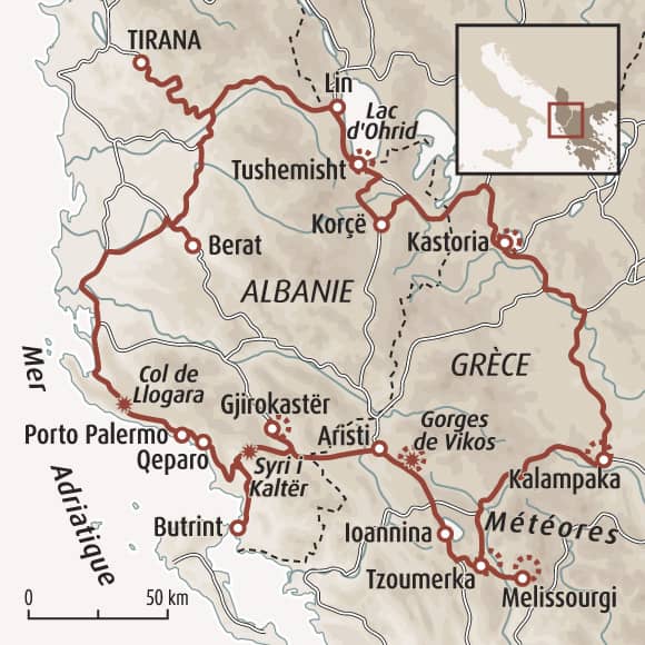 Nous partons de Tirana, vibrante et contrastée, avant de glisser vers les lacs et montagnes du sud-est albanais. La route se prolonge en Grèce du Nord, entre villes byzantines, monastères suspendus des Météores et reliefs sauvages de l’Épire. Nous marchons dans les gorges de Vikos, ralentissons dans les villages de Zagori, puis retrouvons l’Albanie par Gjirokastër et Butrint, où l’histoire se lit dans la pierre. La Riviera albanaise apporte une respiration marine avant les cités de Berat et Tirana. Un itinéraire façonné avec finesse, alternant engagement physique, culture vivante et grands espaces, pour une expérience riche, fluide et profondément ancrée dans le territoire.