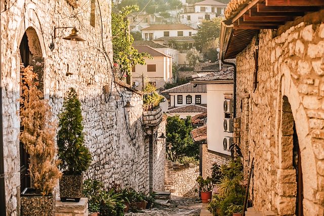 Après le passage de frontière Grèce/Albanie, direction Gjirokastër, ville historique inscrite au patrimoine mondial de l’UNESCO. Surnommée la "Ville de Pierre", elle se distingue par ses maisons-tours ottomanes, les kullas, aux toits de lauze. La visite inclut la Maison Skënduli, exemple raffiné de l’architecture domestique ottomane, et le imposant château de Gjirokastër, qui abrite un musée des armes et offre une vue panoramique sur la cité.