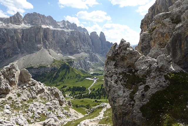 Traversée très lunaire du massif de la Sella jusqu'au Passo Pordoï (2239m), au sud du massif. Nous continuons jusqu'au pied du plus haut sommet des Dolomites : la Marmolada (3343m), au bord du lac de Fedaia. Auparavant, nous aurons suivi de très beaux chemins en balcon.