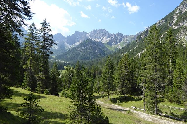 > Au départ du refuge Schachenhaus, le passage du col frontière entre l’Allemagne et l’Autriche à Meiler Hütte (refuge sur la frontière) s’effectue en 1h30 environ. S'ensuit une belle descente dans la vallée de Bergleintal, au-dessus du plateau de Leutasch.