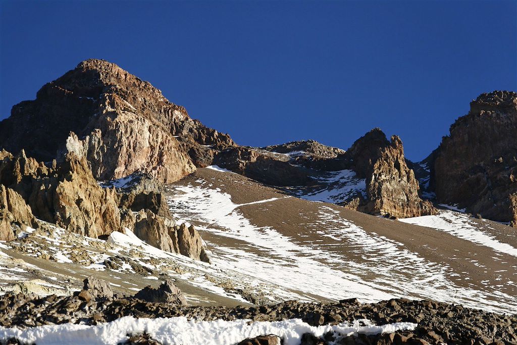 Point culminant de la cordillère des Andes, l'Aconcagua (6962m), colosse de l'Amérique, domine la province de Mendoza. Gigantesque massif couronné de reliefs volcaniques, les flancs hérissés de pénitents de glace et battus par un vent, souvent très violent, défendu au sud par une paroi haute de 3000 mètres, l'Aconcagua trouve son talon d'Achille sur la face nord-ouest. L'absence de difficulté technique est compensée par une météorologie fantasque, qui peut rapidement décourager les moins motivés. La haute altitude, le froid, le vent et parfois la pluie ou la neige, constituent une véritable épreuve pour celles et ceux qui désirent approcher leurs limites physiques et de résistance à l'isolement. La conquête du géant des Andes dès 1897 par l'alpiniste suisse Zübriggen a donné le feu vert à une suite ininterrompue de tentatives et réussites de très nombreuses expéditions. L'esprit des premiers explorateurs a rapidement succombé au nationalisme et à la véritable compétition. Aujourd'hui l'ascension de l'Aconcagua par sa voie normale représente un véritable challenge pour les randonneurs expérimentés, montagnards avertis et endurants, tentés par l'expérience de la très haute altitude.