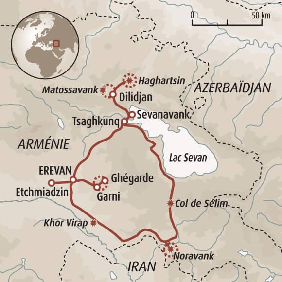 Voyager en Arménie, c’est parcourir un pays aux frontières de l’Orient et de l’Occident, façonné par son histoire millénaire et ses paysages contrastés. Ce circuit s’adresse à ceux qui souhaitent conjuguer découvertes culturelles, randonnées accessibles et moments de liberté pour s’imprégner de l’atmosphère locale. Nous explorons Erevan, capitale vivante et chaleureuse, les monastères inscrits à l’UNESCO, les villages de montagne et les rives du lac Sevan. L’itinéraire alterne visites guidées et temps libres pour flâner, rencontrer et savourer la gastronomie arménienne. Entre traditions, hospitalité et nature grandiose, ce voyage révèle une Arménie authentique et généreuse.