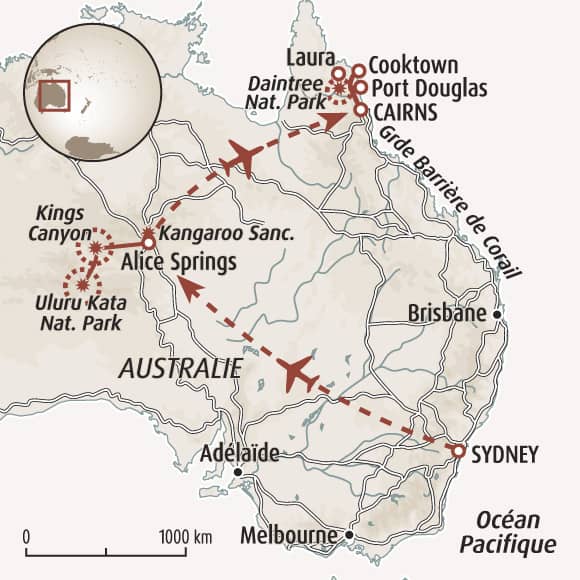 Ce voyage se vit comme une grande traversée en mouvement, une itinérance qui relie villes, territoires bruts et horizons tropicaux à un même tempo. Il s’adresse aux voyageurs curieux et engagés, en quête d’aventure, de diversité de paysages et de découvertes culturelles profondes. Vous commencez à Sydney, en marchant et en pédalant entre baie lumineuse, jardins ouverts et quartiers anciens, portés par l’énergie urbaine. Puis le tempo change. Vous vous enfoncez vers le Centre Rouge, où le corps ralentit face aux étendues minérales de Kings Canyon, d’Uluru et de Kata Tjuta, dans le silence et la lumière du désert. Le rythme change au nord, entre Cairns et Port Douglas, lors d’une journée sur la Grande Barrière de Corail et d’une traversée de la forêt humide de Daintree jusqu’à Cape Tribulation. Enfin, vous vous élancez en 4x4 sur les pistes de la péninsule du Cap York, entre forêts tropicales, sites d’art aborigène de Cooktown et immersion dans une nature vivant. Un voyage de sens, de partage et de reconnexion.