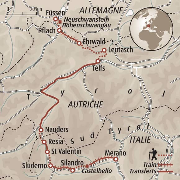 Des châteaux féeriques de Füssen aux vergers ensoleillés du Tyrol du Sud, ce voyage vous plonge au cœur d’un monde alpin enchanteur. Au fil des eaux turquoise du Lech, vous cheminez entre prairies d'altitude et reliefs escarpés, jusqu’aux paysages grandioses de la haute vallée de Leutasch. Là, le mythique chemin de Saint-Jacques vous guide à travers landes, forêts et falaises vertigineuses plongeant vers la vallée de l’Inn. Passez le col de Resia, à la frontière italienne, où les sentiers serpentent entre les lacs d'altitude jusqu’au clocher immergé du lac de Resia. Traversez les pentes douces et les vergers du Vinschgau, dominés par des cimes enneigées, avant d'atteindre Merano, cité thermale au charme méditerranéen, point final de cette traversée alpine riche en contrastes.