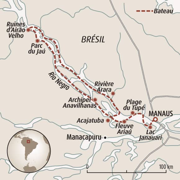 Le rythme de ce voyage est lent et paisible, calqué sur le mouvement tranquille du Rio Negro. Il s’agit avant tout d’une immersion contemplative et sensorielle au cœur de l’Amazonie, où l’on prend le temps d’observer la forêt qui s’éveille, les reflets du fleuve et les sons de la nature. Les journées restent douces, avec des navigations, des balades en canoë ou à pied et des moments de détente sur les plages ou à bord. Ce voyage favorise la déconnexion, l’attention aux détails de la nature et la pleine immersion dans un environnement unique, plutôt que l’action ou l’intensité physique.