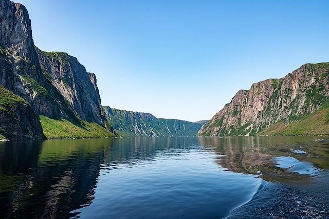 Fenêtre sur l’intérieur. Ce matin, nous rejoignons l’embarcadère de Western Brook Pond, fjord spectaculaire enclavé dans les terres du parc national du Gros-Morne. Une courte marche à travers tourbières et épinettes nous mène jusqu’au lac. Là, nous embarquons pour une croisière silencieuse entre les parois vertigineuses, vestiges d’un ancien fjord glaciaire. L’eau est noire, les falaises s’élèvent à pic, les cascades s’élancent sans bruit. Le regard glisse sur les lignes du relief, happé par la verticalité. Une traversée contemplative, au cœur du minéral.