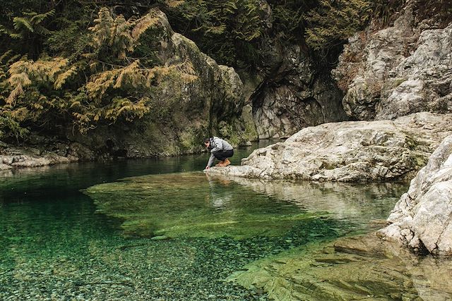 Le parc de Wells Gray surnommé le "parc des cascades" s’étend sur plus de 5000km² et abrite une faune sauvage riche et variée composée de 219 espèces d’oiseaux et plus de 50 espèces de mammifères. Nous nous promenons jusqu’aux chutes Dawson, qui s’étendent sur 20m de haut et 90m de large, et Helmcken, les plus célèbres du parc, 141m de haut soit trois fois plus que les chutes du Niagara ! Nous poursuivons notre exploration sur la Trophy Mountain dans le secteur Spahat Creek Falls, une randonnée exceptionnelle dans un décor à couper le souffle. Ici nous passons d’un paysage typique des Rocheuses à un décor subalpin avec des arbres nains et une végétation fragile. Au retour, nous nous arrêterons pour observer la magnifique cascade de Saphat et son canyon creusé dans les couches de roche volcanique.