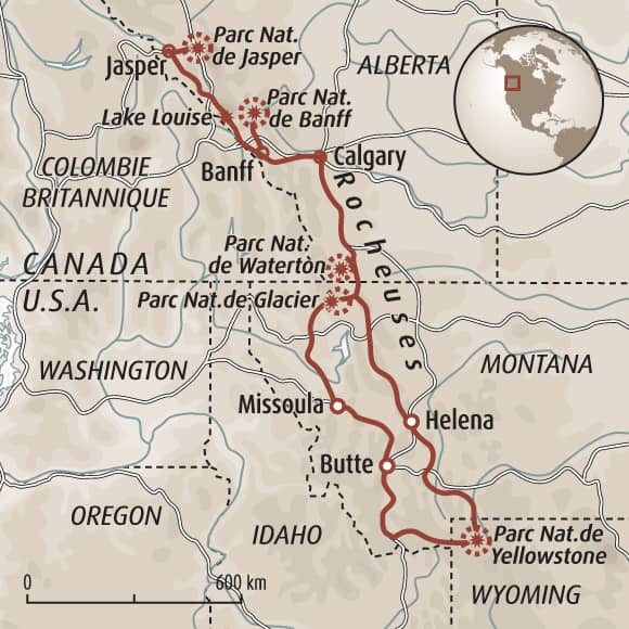 Après un dernier réveil dans l’atmosphère paisible d’East Glacier, vous prenez la route vers le nord pour franchir la frontière canado-américaine et rejoindre les Rocheuses canadiennes. Cette journée de transition offre une traversée spectaculaire de paysages grandioses, entre vastes prairies, vallées alpines et chaînes de montagnes aux sommets encore enneigés selon la saison.