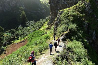 Transfert (30mn) le long de la côte, avant de remonter la luxuriante vallée de Paul jusqu'à la fin de la route. Les petits sentiers qui vont de hameau en hameau vous font traverser en balcon le cirque très cultivé de Cabo da Ribeira, où, selon les saisons, on récolte café, oranges, goyaves, légumes et tubercules de toutes sortes, et où l'on distille le rhum. Dans le petit vallon isolé de Figueiral, une famille cuisine pour vous les produits locaux. Continuation à pied jusqu'au bord de mer et retour à l'hébergement pour la seconde nuit.