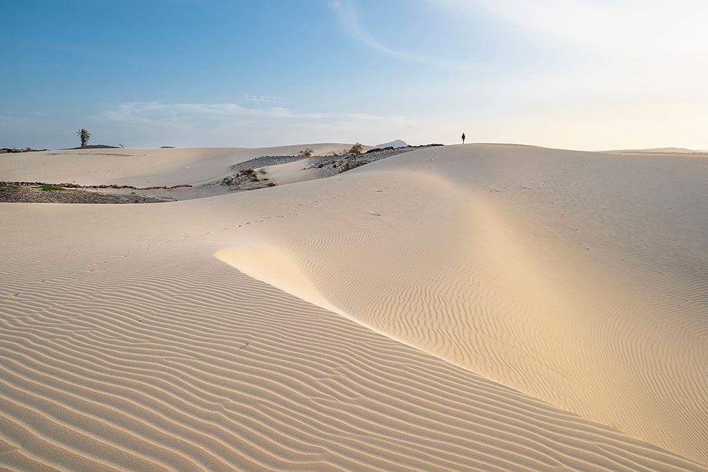 Le matin, notre chauffeur nous amène à proximité de Rabil, d’où nous partons à l’assaut du désert de Viana. Le vent dominant du nord-est s’engouffrant entre deux montagnes a déposé ici, sur plusieurs kilomètres, une trainée de sable qui forme un véritable désert de dunes parmi lesquelles nous serpentons jusqu’à rejoindre le village de Bofareira. Retour à Sal Rei.