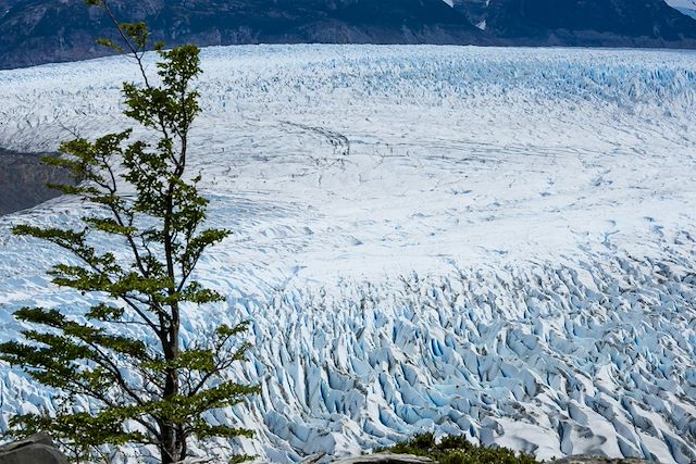 Nous reprenons notre minibus (environ 8 km) pour aller au petit embarcadère de Pudeto et prendre un bateau pour traverser le lac turquoise de Pehoé. Nous débarquons au camp Paine Grande et partons randonner le long du lac Grey jusqu'au mirador du glacier éponyme, l'un des plus imposants de la région. Sous la pression, le glacier craque et vêle de nombreux icebergs qui dérivent sur le lac et le parent de leur intense couleur bleue. Nous retournons au campement Pehoé en fin d'après-midi.