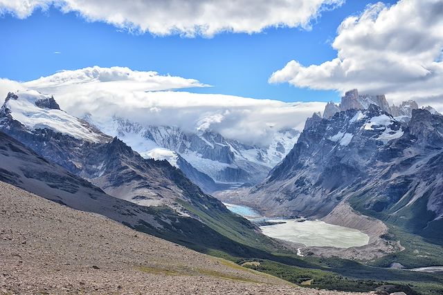 Nous partons à pied du village et nous démarrons la randonnée par une montée progressive vers le Cerro Rosado ; nous faisons une courte pause au campement Rio Blanco, réservé aux alpinistes ; les plus en forme pourront monter jusqu’à la Laguna de los Tres (300m de dénivelé supplémentaire). En haut, l’imposante pyramide de granite du Fitz Roy trône au milieu de l’amphithéâtre des aiguilles qui l’entourent et nous sert de toile de fond. Cette randonnée nous permet aussi de découvrir les Lagunas Madre y Hija ainsi que la Laguna Capri où nous marquons un arrêt. Le sentier surplombe la vallée du Rio de las Vueltas jusqu’au village d'El Chalten et nous offre de très jolis panoramas.