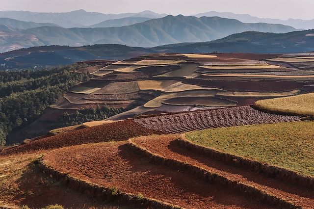 Aux confins sud-ouest de la Chine, le Yunnan est un trait d'union entre les basses terres fertiles et les contreforts du Tibet. Il offre un terrain de jeu idéal pour des aventures accessibles dans une myriade de paysages aux noms évocateurs. Nos randonnées nous mènent des Terres Rouges de Dongshuan aux légendaires rizières de Yuanyang, véritables "miroirs du ciel". Le fleuve Jinshajiang dévale les gorges du Saut du Tigre, dominées par les sommets enneigés tels que le Mont du Dragon de Jade. Nous partons à la rencontre des peuples minoritaires de la région : les Bai qui fabriquent la teinture à l'indigo, ou encore les Naxi et leurs villages en pierre. Un parfum de spiritualité imprègne notre périple, tant au temple de Confucius à Jianshui, qu'au monastère de Songzanlin à Shangri-La.