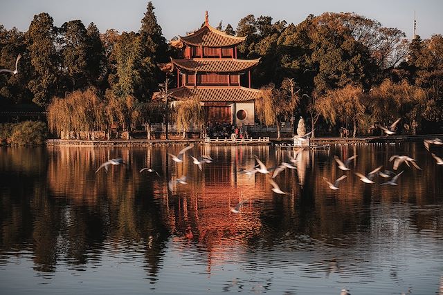 Route vers Lijiang, puis promenade dans la vieille ville jusqu’au parc de l’Étang du Dragon Noir, où l’eau reflète les toits anciens et les montagnes lointaines. Une dernière promenade apaisante avant de quitter le nord du Yunnan.