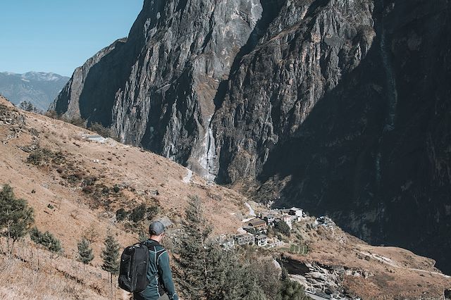 Le sentier s’élève progressivement, serpentant à travers les fameux 28 lacets, autant de virages serrés qui dévoilent, à chaque demi-tour, de nouveaux panoramas sur le fleuve Jinshajiang rugissant au fond de la gorge. Nous randonnons le long de chemins de terre et de pierre, entre forêts de pins, falaises abruptes et villages Naxi. L’arrivée au Tea Horse Guesthouse, littéralement posé au-dessus de la gorge, nous offre des vues spectaculaires du mont enneigé du Dragon de Jade (Mont Yulong - 5596m), ainsi que du fleuve lointain, sublimées par la luminosité de fin de journée.