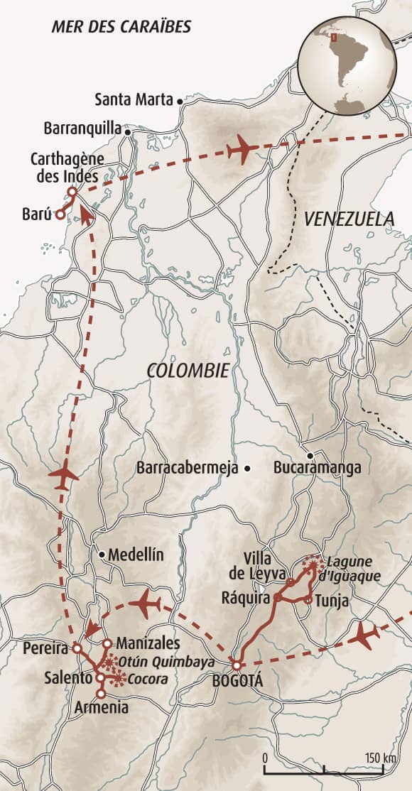 Un voyage riche et passionnant pour découvrir les sites incontournables de Colombie et d'autres totalement confidentiels. Vous démarrez à Bogota et roulez dans les ruelles de la Candelaria à la recherche du street art qui orne les murs : chaque dessin est l'occasion de s'immerger dans l'histoire de la Colombie. Vous rejoignez ensuite le village colonial de Villa de Leyva pour faire une belle randonnée à la lagune d'Iguaque et découvrez l'écosystème de type paramo unique à quelques pays andins. Votre prochaine destination vous mène dans la région du café pour deux nouvelles randonnées entre palmiers de cires géants et végétation tropicale. Enfin la côte Caraïbes et Carthagène illuminent votre fin de séjour avec notamment une journée dédiée à l'observation des oiseaux et la plage.