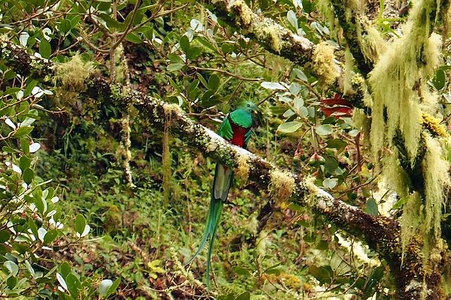 Réveil matinal avec le chant des oiseaux, nombreux autour du lodge, et départ pour une jolie randonnée dans les environs, à une altitude de 2200-2400 mètres. Les sentiers traversent la fraîcheur de la forêt nuageuse de San Gerardo de Dota, et nous évoluons au cœur de chênaies, de ruisseaux cristallins et d’une remarquable diversité d’oiseaux, dont... le quetzal ! Cet oiseau mythique, légende maya, ne laisse personne indifférent, avec sa longue queue d'un bleu-vert électrique... Nous rejoignons le lodge en début d'après-midi, et prenons la route de retour pour la capitale. Dîner libre pour cette dernière soirée Tica.