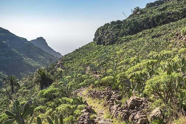 Notre randonnée débute au cœur des cultures et bananeraies en terrasses, puis nous passons près de la belle cascade d’El Cedro, la plus importante de l'île, dont les eaux coulent dans la vallée d'Hermigua. Jadis près d'une demi-douzaine de moulins était en activité pour irriguer les cultures.