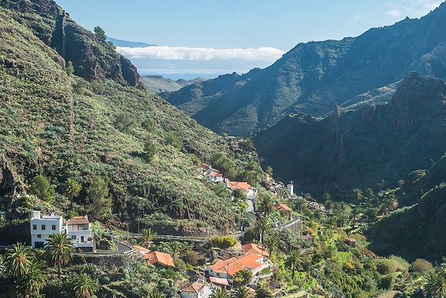 Depuis les crêtes, nous avons une vue panoramique de la vallée d'Alojera et ses cultures de palmiers ; nous redescendons par un petit sentier avec vue sur l’océan et l'île de Tenerife pour rejoindre notre point de départ.