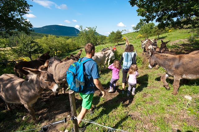 Mener un âne en randonnée : voyager avec un âne est un formidable moyen de randonner en famille, au rythme lent de l'animal. Il sera un compagnon fabuleux pour les petits comme pour les grands.