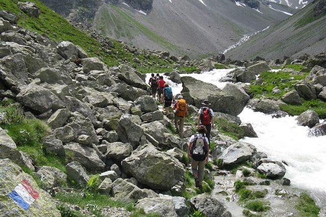 Au départ du refuge, nous montons à flanc de montagne vers le col de Vaurze, frontière naturelle entre les Alpes du Sud et du Nord. C’est sous le chant de belles cascades que nous apprécierons les derniers panoramas magnifiques sur la partie méridionale des Ecrins. Passage du col de Vaurze (2500m) puis dans cet environnement très minéral, nous aborderons la descente sur le Désert en Valjouffrey, lieu aussi sauvage qu'apaisant.