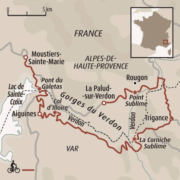 L'après-midi, vous pouvez profiter du village ou bien reprendre les vélos pour une boucle additionnelle (40km - 600D+/D-) jusqu'au lac de Sainte Croix.