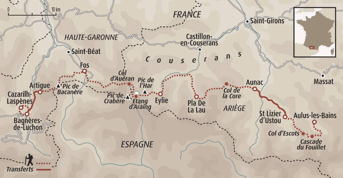 Le matin, transfert d’Aunac à St Lizier d’Ustou pour éviter un long et difficile détour du GR10. Toutefois possibilité de rajouter 1 jour de randonnée et rejoindre St Lizier d’Ustou via une variante du GR10 (Tour du val du Garbet) ou en 2 jours de randonnée via le GR10 (nous consulter). Au départ de St Lizier d'Ustou, au cœur d'une belle vallée, vous gagnez le col d’Escots. Depuis ce dernier, s’ouvre une belle vue sur les derniers hauts sommets frontaliers du Couserans. Puis vous basculerez en direction du village thermal d'Aulus les Bains via le cirque Casérien et la jolie cascade du Fouillet. Un détour possible via l’étang de Guzet et la cascade d’Ars permettra d’admirer une des plus belles cascades des Pyrénées.