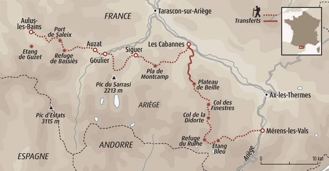 D’Aulus-les-Bains, la montée en direction du Port de Saleix (1794m), demande un certain effort, du fait des 1100m de dénivelé positif. Durant votre ascension, de nombreuses curiosités viendront vous distraire : d’anciennes granges bien conservées, la fraîcheur des ruisseaux et leur flore spécifique, une ancienne mine d’extraction… Du Port de Saleix, vous pourrez admirer la vue vers la vallée d’Auzat et de Vicdessos, puis les étangs de Bassiès, avant de rejoindre le refuge. Possibilité d’une variante hors GR10 via les crêtes panoramiques de Bassiès et les superbes étangs des Lavants.