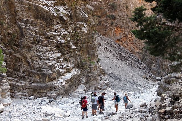 Les parois rocheuses se resserrent progressivement, formant un défilé étroit aux falaises abruptes et minérales. Le lit de la rivière, souvent sec en été, est bordé de galets et de végétation méditerranéenne tels les genévriers, cistes et quelques pins. Nous atteignons le cœur des gorges et suivons le lit de la rivière jusqu'au village d'Agia Roumeli en bord de mer.