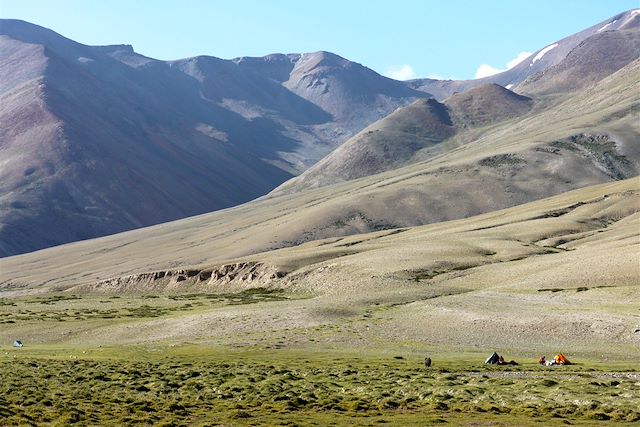Le matin, nous suivons d'abord les gorges de Tsarap Chu, puis, après environ 2 kilomètres, nous longeons les rives de la petite rivière Tok Phu en direction de l'est. Une ascension progressive d'environ 2 heures nous mène au magnifique lac Tso Tok. Il mesure plus de 1,5 km et offre un spectacle surprenant dans ce paysage autrement aride, un lieu idéal pour déjeuner. Puis, nous suivons à nouveau la Tok Phu et entrons dans une vallée au sud, où une pente assez raide mène au camp de base de Nyalo Kuntse. De là, nous avons un excellent point de vue et sommes proches du col Nyalo Kuntse La que nous franchirons demain.