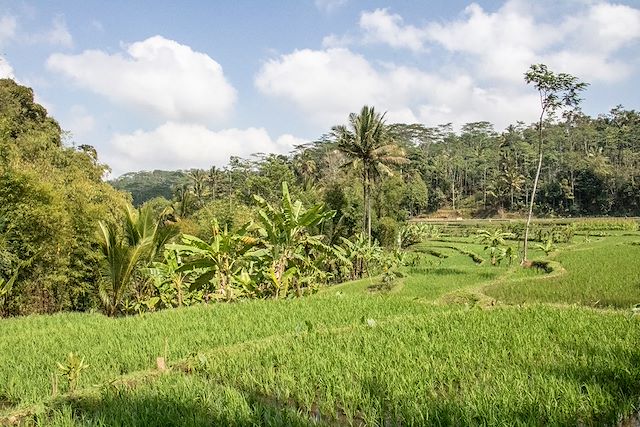 Le matin, avant de rejoindre le temple de Mekori, nous préparons avec une famille locale les offrandes rituelles que les balinais confectionnent chaque jour pour honorer leurs dieux. Nous rejoignons ensuite ce temple datant du 8e siècle et perdu dans la jungle. Il est entouré d'immenses banians aux racines aériennes et peuplé de quelques singes. Une ambiance "Indiana Jones" se dégage de ce lieu. Depuis le temple, nous débutons une magnifique balade dans au cœur des rizières avec de très beaux passages dans des forêts de bambous et palmeraies, plantations de café et cacao. Les sentiers sont parfois un peu glissants (possibilité de passage d'un petit gué en enlevant nos chaussures). Un buffet de spécialités balinaises nous sera servi dans les rizières en guise de déjeuner. Puis, continuation de notre route vers Ubud. Située dans les collines au nord de Denpasar, Ubud est réputée pour son école de peinture. Malgré le développement touristique exponentiel qu'elle a connu ces dernières années, la cité a su préserver sa beauté même si la présence de touristes est assez forte. D’élégants temples et palais aux façades sculptées jalonnent les rues. L’après-midi, visite du palais royal et de ses magnifiques jardins, puis d’une autre curiosité touristique d’Ubud, légèrement en retrait du centre-ville, le temple « de la forêt de singes ».