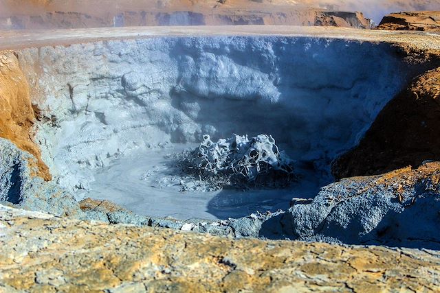 Nous quittons doucement la région de Mývatn, au cœur du rift volcanique actif. Ici, les paysages sont parmi les plus contrastés de l’île : solfatares, cratères, coulées de lave et lacs peu profonds se succèdent dans une ambiance minérale. Nous commençons la journée par la découverte du site de Námaskard, où les marmites de boue bouillonnent et les fumerolles s’élèvent dans l’air. Le sol vibre, les couleurs tranchent, l’activité géothermique est partout. Nous reprenons la route vers l’est pour rejoindre Dettifoss, réputée pour être la chute la plus puissante d’Islande. Le débit impressionne, le grondement résonne dans la gorge. L’après-midi marque une transition : nous quittons les reliefs volcaniques pour traverser la partie la plus désertique de notre itinérance. Quelques heures de route à travers des étendues silencieuses, presque lunaires, avant que le décor ne change à nouveau. Les fjords de l’Est apparaissent, découpés, plus verts, plus doux, tout en transition. Nous nous installons pour la nuit en guesthouse dans l’un de ces fjords, entre mer et montagne, pour une nouvelle étape du voyage.