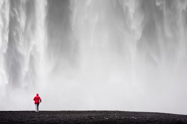 Nous poursuivons vers Skógafoss, chute rectiligne de plus de soixante mètres, que nous approchons à pied pour ressentir la puissance de l’eau. Un peu plus loin, Seljalandsfoss offre une autre perspective : nous pouvons en faire le tour, passer derrière le rideau d’eau et observer le paysage à travers les gouttes.