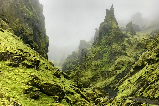 L’après-midi, nous prenons de l’altitude pour rejoindre Þakgil, un site étonnant niché entre les crêtes, à l’écart de la route principale. Une randonnée nous mène à travers des vallées encaissées, des mousses épaisses et des reliefs sculptés par l’érosion. Le contraste avec les paysages traversés les jours précédents est saisissant. Nous passons la nuit sur place, dans ce site absolument unique, entourés de montagnes et de silence. Une étape à part, hors du temps, qui marque le voyage.