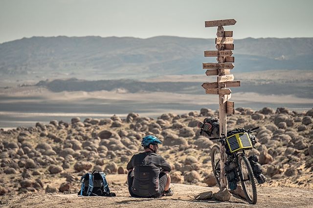 Difficultés particulières : itinéraire avec quelques montées. Quelques pistes et chemins sont parfois accidentées mais sans difficultés majeures. Descente technique nécessitant de pousser le vélo le J6 pour rejoindre le lac salé de Tuzbair.