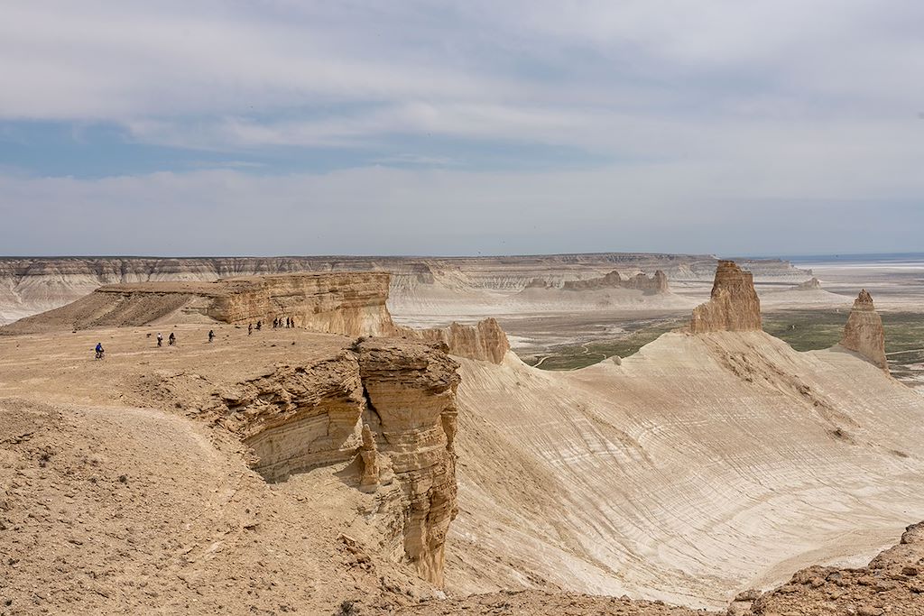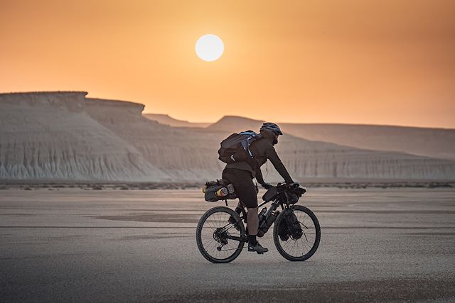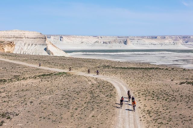 Pour cette dernière journée de vélo, nous descendons au coeur du parc de Bozjira, sous les promontoires que nous avons eu la chance d'explorer la veille. Un décor irréel, toujours aussi impressionnant. Une fin en apothéose avant de rentrer à Aktau en véhicule pour célébrer cette traversée autour d'un diner traditionnel.