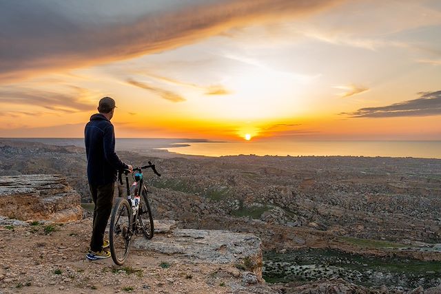 Arrivée dans la nuit à l'aéroport d'Aktau.Le matin rencontre de notre équipe locale, briefing, préparation des vélos et des bagages pour la traversée avant un transfert vers notre premier lieu de bivouac à Zhygylgan. Un spot déjà incroyable face à la mer Caspienne.