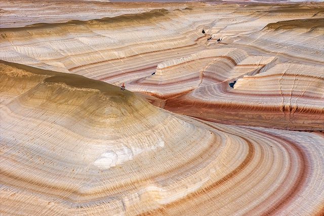 Nous prenons la direction du site de Tiramisu, qui nous surprend immédiatement par ses formes douces et ses couleurs inhabituelles. De larges collines aux courbes régulières s'étendent devant nous, avec des strates blanches, rouges et ocres qui se succèdent et composent un paysage unique, cette alternance de couleurs a valu au site son surnom de « Tiramisu ». Nous prenons le temps d’en faire le tour et d’observer les détails, tandis que la lumière fait varier les teintes au fil des heures. En fin de journée, nous installons notre bivouac au cœur des collines, dans un calme absolu. Le coucher de soleil teinte une dernière fois les reliefs, avant une nuit paisible. Au réveil, les premières lueurs redessinent en douceur ce décor minéral, offrant un dernier moment suspendu avant de reprendre la route.
