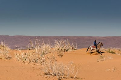 Au Sud de Ouarzazate, les derniers massifs montagneux du Saghro et de Djebel Bani marquent la frontière avec le Sahara. Le vrai désert commence bien là ! Nous vous proposons de vivre une véritable expérience équestre Saharienne. Une traversée intégrale des ergs entre M’Hamid et Foum Z’Guid. Une assistance efficace nous permet de nous enfoncer au cœur des dunes et d’être coupé de la civilisation pendant cette semaine. Nos chevaux Barbes et Arabe-Barbes, coursiers du désert, sont parfaitement adaptés à ces climats et terrains. Il n’est pas rare de croiser gazelles et fennecs au milieu des dunes où seul nos montures permettent de pénétrer… Un vrai voyage Saharien !