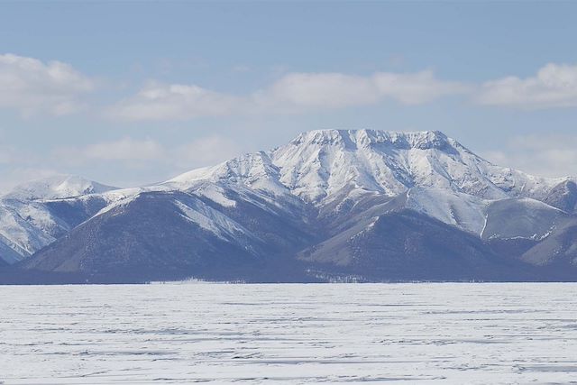 Nous remontons le lac pour rejoindre la presqu'île Dolon Uul, parcours d'environ 55km qui réserve souvent des surprises. Les premières glaces de l’hiver, brisées par les dernières tempêtes de l’automne, viennent généralement s’accumuler et créent des crêtes de compression. La glace du Khuvsgul est d'une incroyable pureté où des milliers de bulles blanches sont enfermées. Il faut se frayer un passage au milieu de ce dédale gelé où l'on peut entendre le bruit de la glace qui claque en grondements sourds. Après avoir longé la frontière jusqu'à Kashim, il restera ensuite à traverser le golfe de Dolon Uul pour rejoindre Zelinanii Bulan à la pointe est de la presqu'île. Cette partie nord du lac est presque entièrement enneigée en hiver, l'atmosphère est ici différente avec les hauts sommets du Khorido Saridag en toile de fond ; des paysages d'une grande beauté pour passer la nuit.