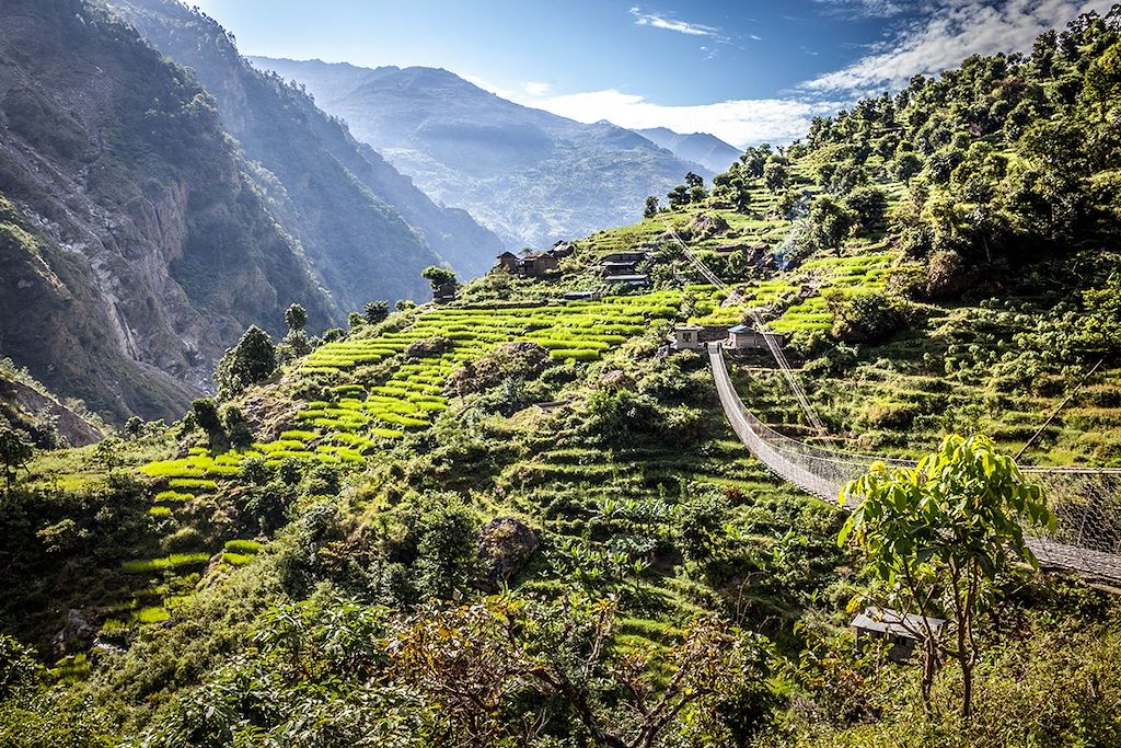 L'objectif de la journée est de rejoindre la rive droite de la Burhi Gandaki, rivière que nous longerons jusqu'à sa source. Nous descendons dans un premier temps jusqu'à la rivière Maccha Khola que nous traversons par un pont suspendu. Nous remontons ensuite jusqu'au village de Singla (2300m). De là, une longue descente avec de nombreuses marches à travers rizières et champs de millet nous permet d'atteindre Khola Bensi.