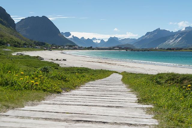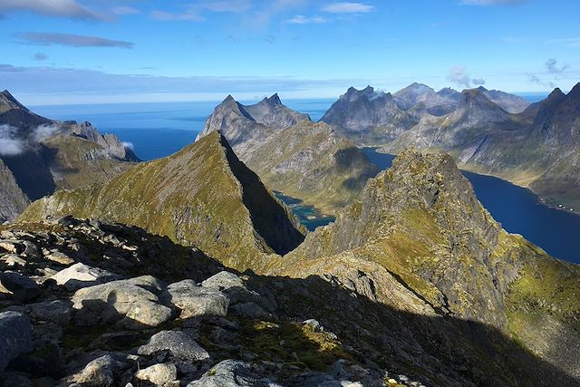 Nous débutons la randonnée par un sentier côtier qui nous permet d’admirer l’archipel des Lofoten depuis le bord de l’eau. Nous nous élevons ensuite rapidement pour rejoindre le plateau de Ballstadheia puis la « dent » de Nonstinden : c’est l'un des plus beaux panoramas de notre périple ! Nous découvrons alors un alpage où paissent quelques moutons, qui nous permet de relier le sommet de Munkan. Pique-nique au sommet puis retour par des escaliers construits par des sherpas népalais !
