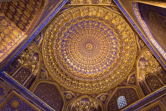 Journée de visites de Samarcande : le Gour Emir, mausolée d'Amir Timur (Tamerlan) et caveau dynastique des Timourides ; c'est un monument architectural unique avec son dôme bleu à nervures. La célèbre place du Registan, centre officiel de l'empire de Tamerlan, abrite les majestueuses madrasas d'Oulougbek, Cher Dor, Tillya Kari et Bibi. Visite de la mosquée Khanym, d'une beauté incomparable, qui fut construite par Timur pour son épouse. Balade dans le bazar oriental Siab, le plus ancien bazar de Samarcande, où les caravanes de la Route de la Soie faisaient halte pour leurs échanges commerciaux. Découverte du mausolée de Shahi Zinda, « la ville des morts », un complexe de plus de 20 bâtiments uniques datés du 11 au 19ème siècles. Puis visite de l'observatoire d'Oulougbek : premier observatoire d'Orient doté d'un sextant de 30m, construit par Oulougbek pour établir un catalogue astronomique précis.