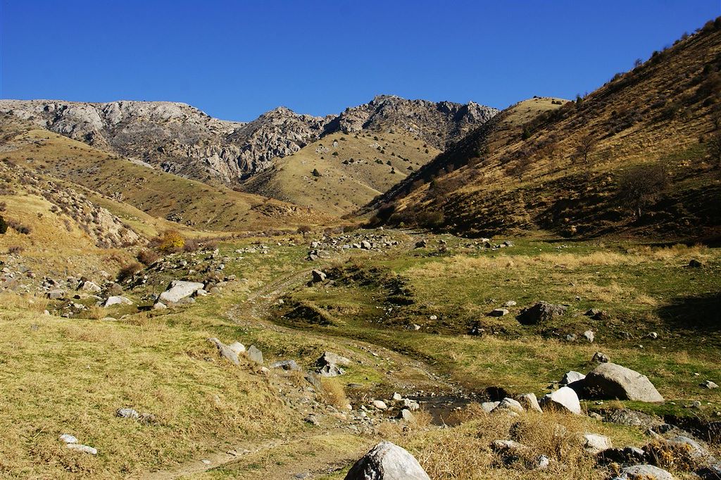 Route pour le village de Guidjal, dans la vallée d'Aksakata : nous pénétrons dans le massif des Tien Shan (les Monts Célestes). Nous commençons notre randonnée à 980m d'altitude, et empruntons le versant nord de la crête jusqu'au cours supérieur de la rivière Koumbel, le Badamsay (affluent gauche de la rivière Beldersay). Nous traversons le pont et, en chemin, pouvons admirer une longue ligne de marbre et des fossiles de coquillages (vestiges d'une ancienne mer), où nous pouvons nous reposer et déjeuner. Après le pique-nique, descente vers le vieux pont menant au confluent des rivières Aksakata (de la vallée de Berikata) et Nurekata (de la vallée du même nom). Nous suivons une piste de campagne pour atteindre l'alpage où nous installons notre premier campement à 1270m d'altitude.