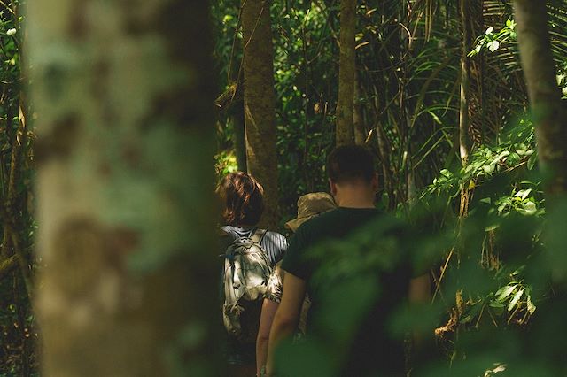 Le jour se lève au son des chants d'oiseaux du paradis amazonien. Après le petit déjeuner, nous marchons dans la forêt épaisse, observant la grande variété de faune et de flore amazonienne. Les animaux se cachent dans leur élément naturel et c'est à force de silence et d'expérience que nous pouvons apercevoir, selon les endroits et les moments, perroquets, aras, toucans, camungos, hoazins, hérons et autres animaux comme les caïmans, les tortues... sans oublier les singes, les coatis ou les paresseux. En général, la journée s'achève par un coucher de soleil avant de dîner au lodge.