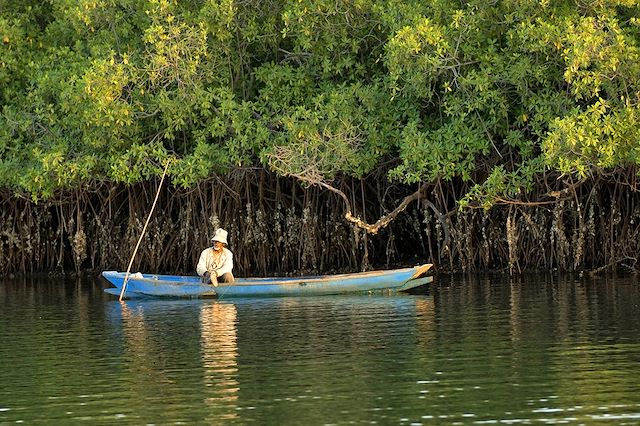 Réveil au chant des oiseaux, petit déjeuner puis balade jusqu'au pont pilotis où nous changeons de paysage pour un écosystème fluvial, dominé par la mangrove.