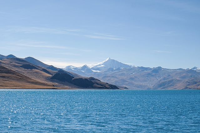 Nous profitons des paysages grandioses qui entourent le lac Yamdrok, l'un des trois grands lacs sacrés du Tibet (balade possible sur les rives du lac). Il mesure plus de 72 kilomètres de long, est entouré de montagnes enneigées et est alimenté par de nombreux ruisseaux. Les Tibétains pensent que sans ce lac, le Tibet ne survivrait pas. Selon la mythologie tibétaine, le lac Yamdrok-Tso est la transformation d'une déesse.