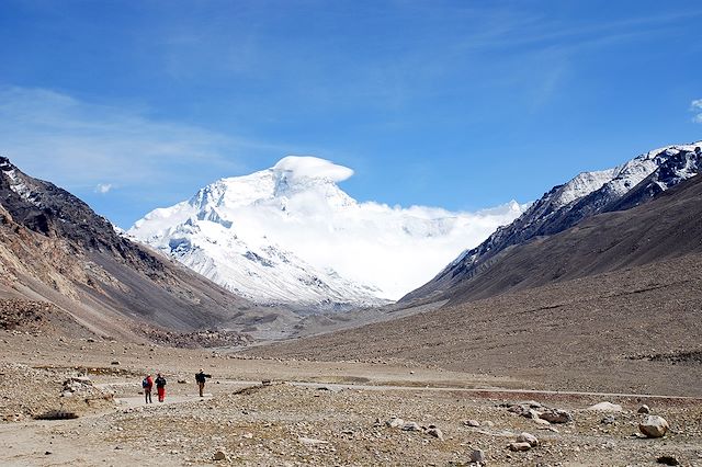 Ce matin, nous prenons la direction de Tingri. Lorsque le temps le permet, nous pouvons admirer au loin la magnifique vue sur l’est du mont Everest. Nous continuons la route pour Rongbuk, en passant le col de Jiawula (5210m) pour admirer de gauche à droite le Makalu, le Lhotse, l'Everest, le Nuptse et le Cho Oyu. Quand le temps le permet, nous profitons du coucher de soleil sur le mont Everest. L'après-midi, randonnée près de Rongbuk, d'où nous pouvons apercevoir le mont Everest au loin.