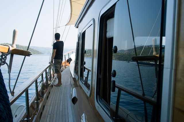 Le matin, nous levons l'ancre et prenons la direction de notre première étape du jour, Akvaryum Koyu, lieu réputé pour la plongée du fait de ses eaux transparentes. Poursuite de notre route vers l’île de Domuz (l’île des cochons), puis l’île de Tersane (l'île du "chantier naval"), la plus grande des 12 îles de la région de Göcek. On y trouve des ruines anciennes comme des églises et des infrastructures du chantier naval de l'époque byzantine. Temps libre pour visiter les ruines, se baigner ou simplement se détendre sur le pont. Diner et nuit à bord.