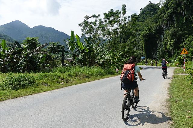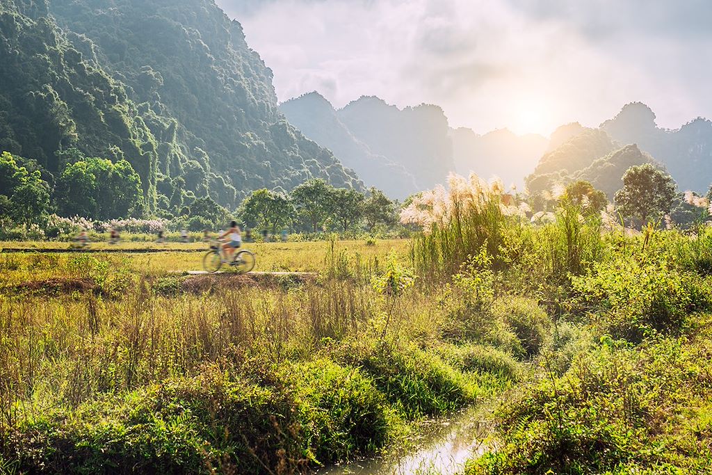 Après le déjeuner, nous reprenons le vélo pour retourner à notre hébergement. Le parcours de retour traverse les champs rizicoles et de nombreux petits villages authentiques, avec toujours en pespective les pitons calcaires du complexe de Trang An.